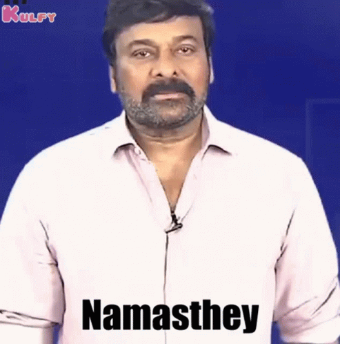 Megastar Chiranjeevi greets with 'Namasthey' and 'Namaskaram' gesture, wearing a white shirt.