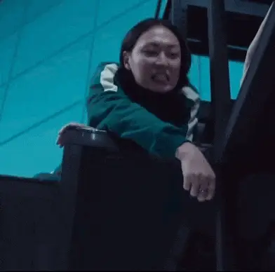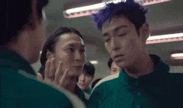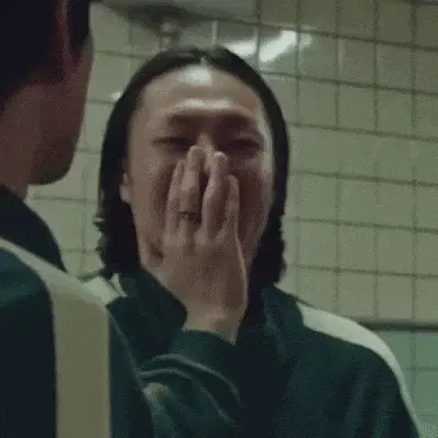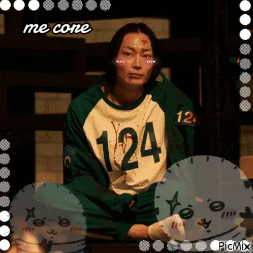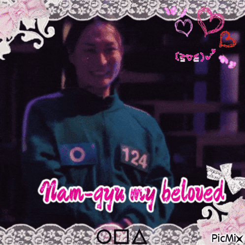 Namgyu, Squid Game player 124, smiles and makes a heart gesture, with 'Nam-gyu my beloved' text overlay.