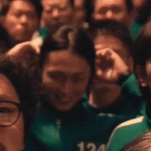 a woman in a green jacket is smiling in a crowd .