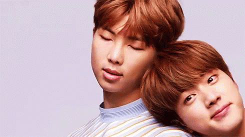 Namjoon and Jin share a sweet, close moment, resting their heads together in a tender embrace.
