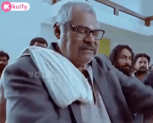 Kota Srinivas Rao claps enthusiastically, wearing glasses and a white shawl, from the movie Attarintiki Daredi.