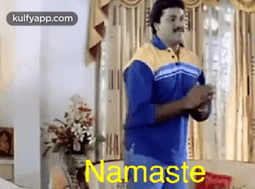 A man in a blue and yellow shirt performs the traditional Namaste greeting with folded hands.