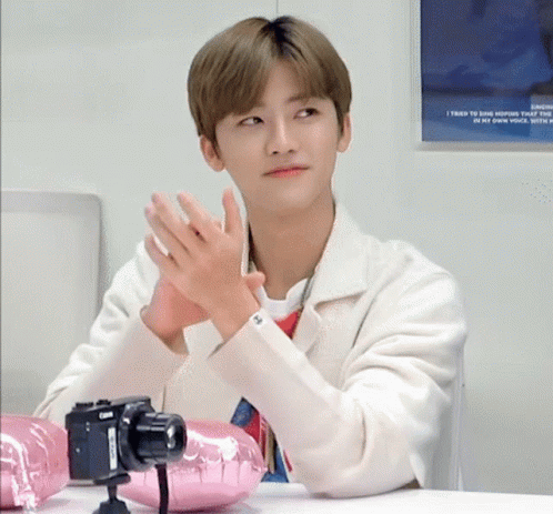 NCT Dream's Na Jaemin (Nana) claps enthusiastically while sitting at a table with a camera.