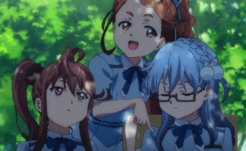 Kono Miyako, Toda Jun, and Maruyama Akane from Nananiji in a cute anime scene, with one girl playfully poking.