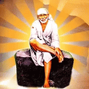 Nandu's painting of Sai Baba, a spiritual figure, sitting on a rock with golden rays.