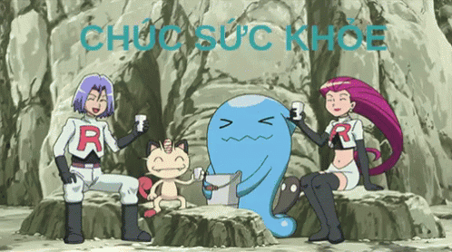 Team Rocket, including Jessie, James, Meowth, and Wobbuffet, raising a toast to health.