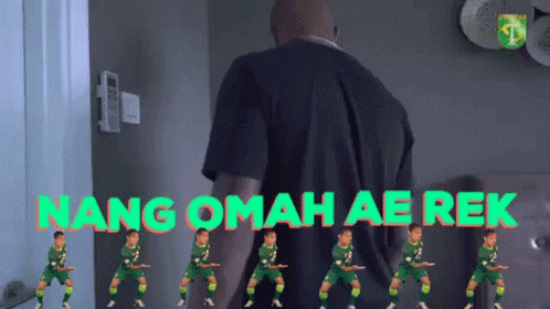 Man in black shirt with 'Nang Omah Ae Rek' text and dancing Persebaya players, featuring David da Silva.