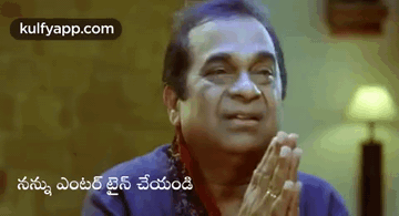 Brahmanandam smiles with folded hands, asking to be entertained, from Attarintiki Daredi movie.