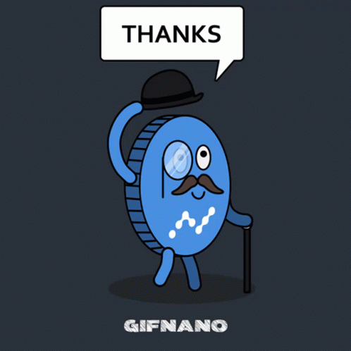A distinguished Nano cryptocurrency coin character, wearing a hat and monocle, says 'Thanks'.