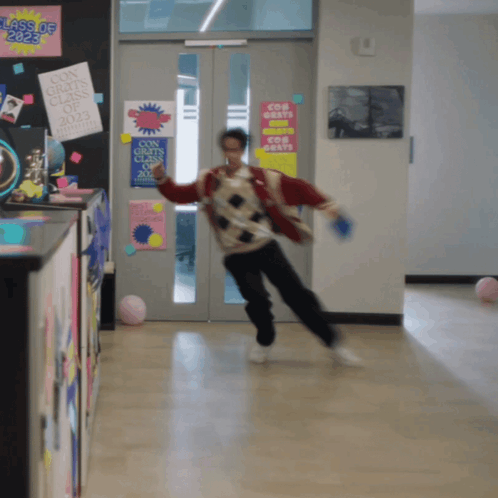 Nanon slides quickly through a school hallway, passing a 'Class of 2023' sign.