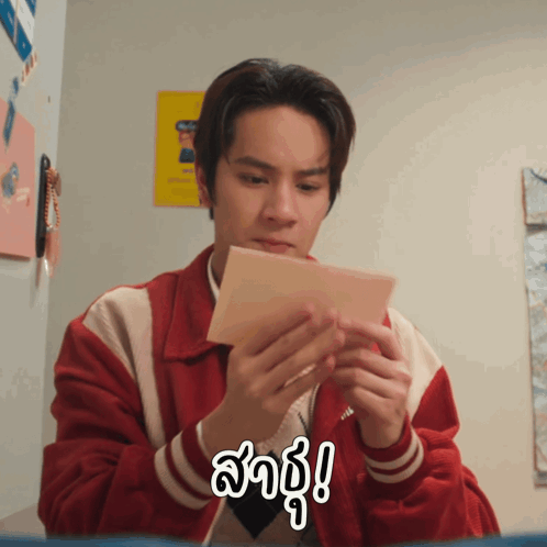 Nanon, wearing a red jacket, holds a paper to his face, making a wishing gesture with hands pressed together.