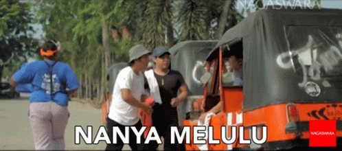 Men showing frustration with constant questions, featuring the text 'NANYA MELULU' on an orange auto-rickshaw.