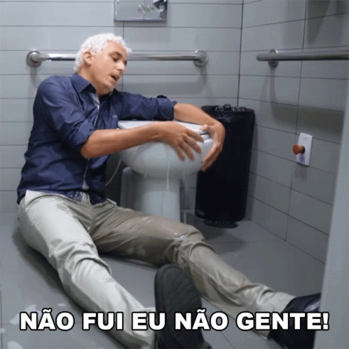 Rafael Portugal sitting on a bathroom floor, looking distressed with wet pants, claiming 'It wasn't me, people!'