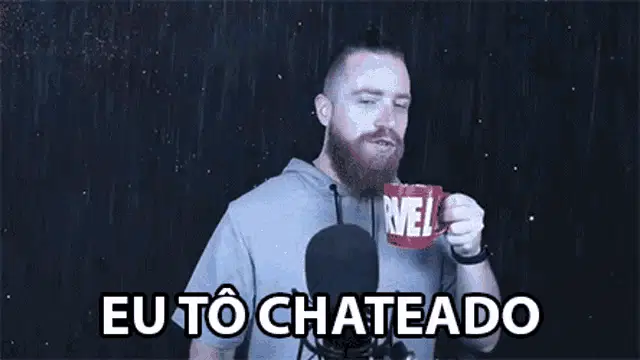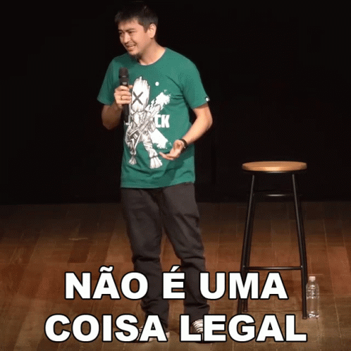 Andre Santi on stage, delivering a stand-up routine with the phrase 'Não É Uma Coisa Legal'.