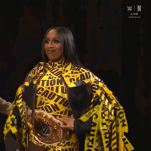 WWE Women's World Champion Naomi smiles, wearing her iconic yellow 'CAUTION' tape outfit and championship belt.
