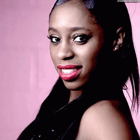 Naomi winks playfully at the camera, showcasing her glittery red lipstick against a plain pink background.