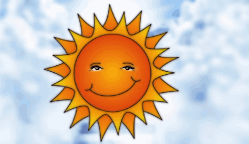 Molnár Orsi's animated sun character, smiling and blinking against a bright, cloudy sky.