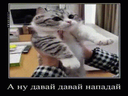 A person playfully holds a cat, encouraging it to 'attack' in a humorous interaction.