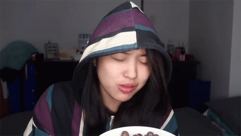 Isseymiyake Parto savoring delicious food, making an expressive face while wearing a striped hoodie.