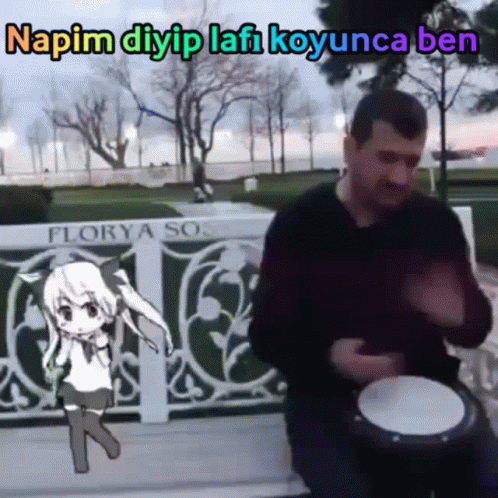 Bilal Göregen plays a hand drum in a park while an animated anime girl dances alongside him.