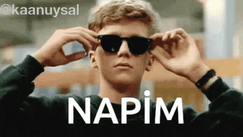 Kaan wearing sunglasses with the Turkish phrase 'Napim' (What should I do?) displayed.