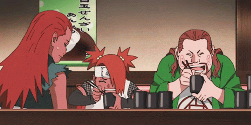 Karui, Choji, and their daughter Chocho from Naruto Shippuden enjoying a meal together.