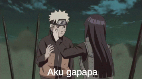Naruto looks sad as Hinata gently strokes his face, offering comfort with the caption 'I'm okay'.