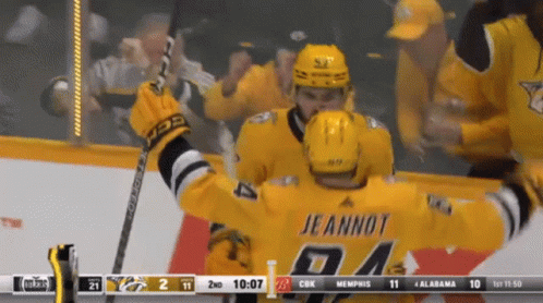 Nashville Predators celebrate a goal, featuring Dante Fabbro, Jeannot (84), and Sissons (10) on the ice.