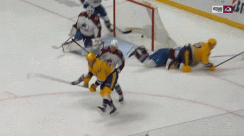 Nashville Predators player Ryan Johansen celebrates a goal with teammates on the ice during a hockey game.