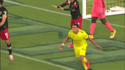 Daniel Rios celebrates scoring a goal for Nashville SC with his teammates on the field.