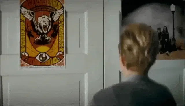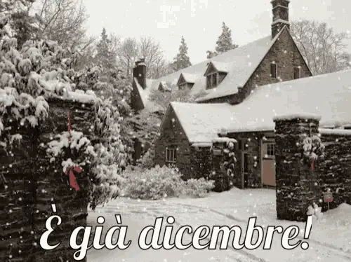 An enchanting animated painting of a snowy Christmas scene with a decorated tree and rustic house.