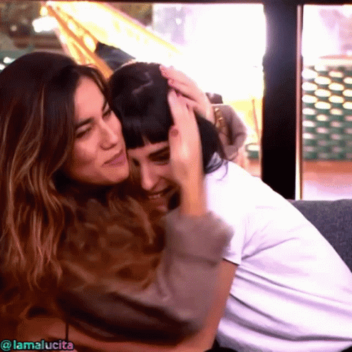 Natalia and Julia Ot share a warm, happy hug, smiling brightly at each other in a moment of friendship.