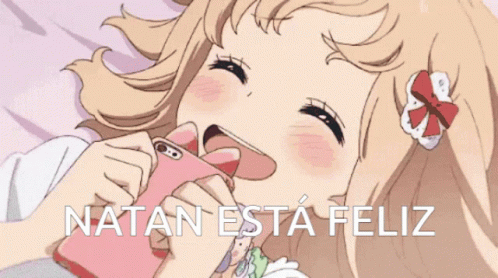 Anime girl Natan is happy, lying on a bed and playing with her phone, then playfully kicking her legs.