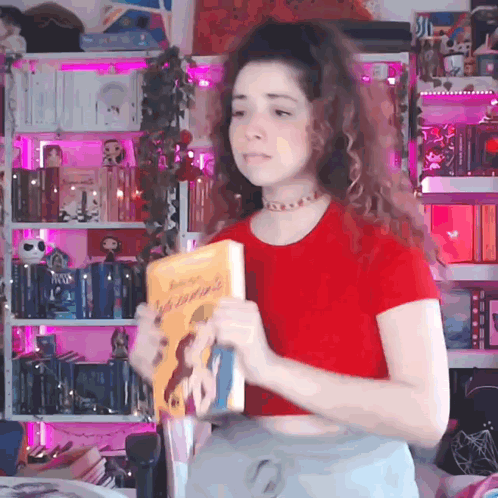 a woman in a red shirt is holding a book that says ' a girl ' on the cover
