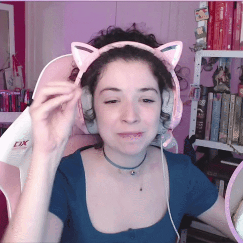 a woman wearing pink headphones with cat ears is sitting in a dx chair