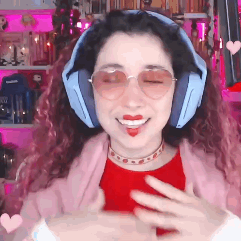 a woman wearing headphones and sunglasses is smiling and holding her hands to her chest .