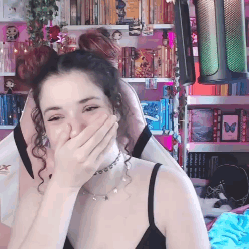 a woman with curly hair is covering her mouth with her hand