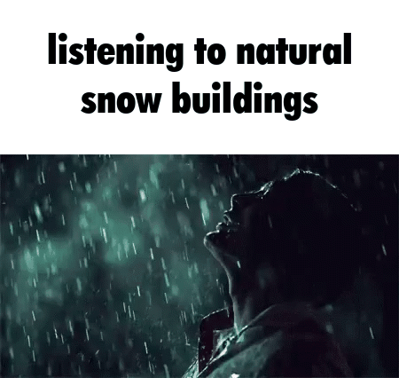 A person listens to Natural Snow Buildings in the rain, with the caption 'listening to natural snow buildings'.
