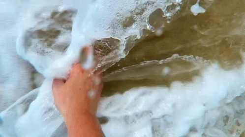 A person's hand gently interacts with foamy ocean waves on a sandy beach, capturing a moment of nature's embrace.