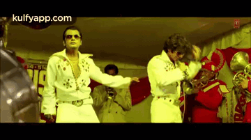 Nawazuddin Siddiqui dances energetically on stage in a white suit, performing with a band.
