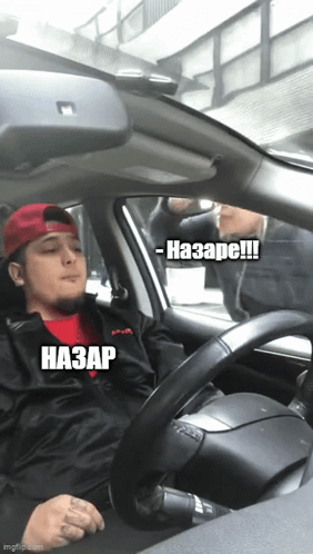 Man in a red hat, Nazare, is called out by another person through a car window in a meme format.