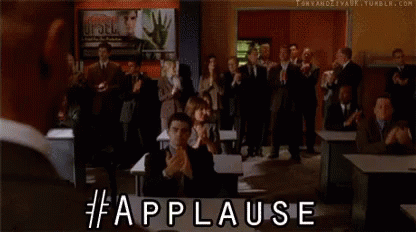 A group of people, likely the NCIS team, enthusiastically applauding in a room.