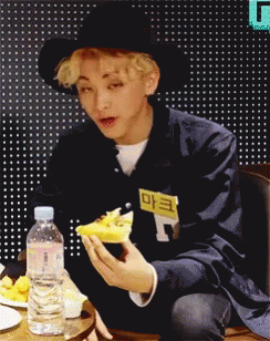 NCT's Mark Lee, wearing a hat, enjoys a slice of pizza during an SM Entertainment event.