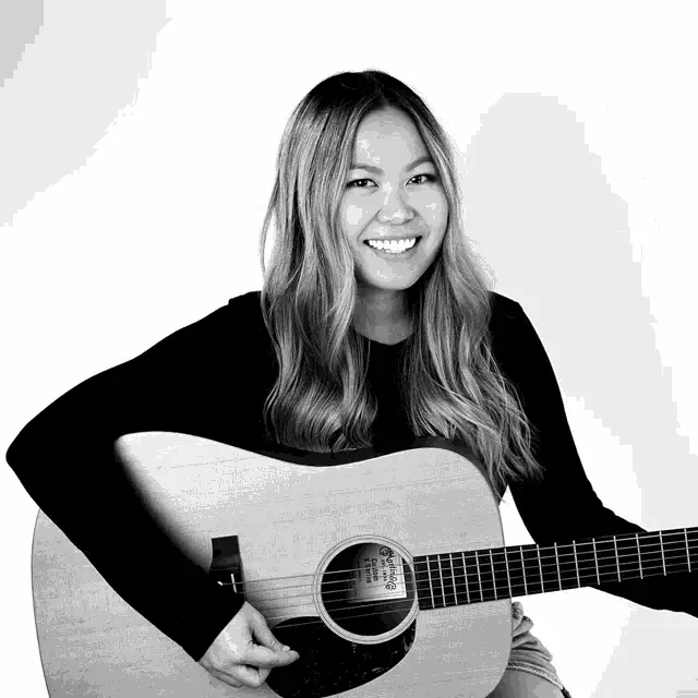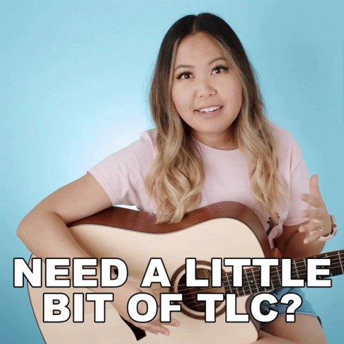 Ellen Chang asks 'Need A Little Bit Of TLC?' while holding an acoustic guitar.