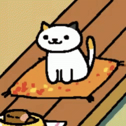 A cute Nekoatsume cat sits on a patterned mat, meticulously washing its face with its paw.