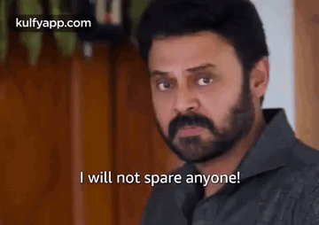Venkatesh from Drushyam2 intensely declares, 'I will not spare anyone!' with a serious expression.