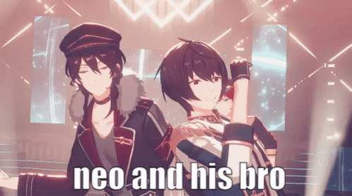 Neo, Ritsu Sakuma, and Rei Sakuma, two anime characters, pose together with the caption 'neo and his bro'.