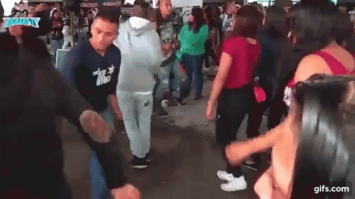 Energetic street dance featuring a group of people moving to the music in a lively outdoor setting.