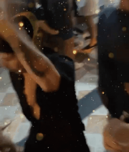 A person in a black top and pirate-like headwear dances energetically at a party, with sparkling effects.