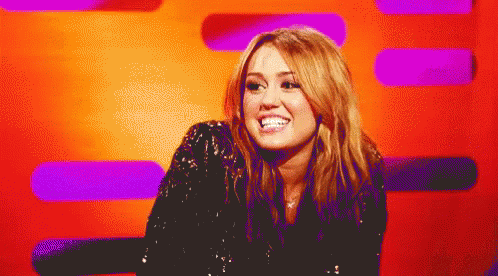 Miley Cyrus flashes a charming nervous smile while wearing a black sequined top against a vibrant background.